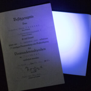 A useful tool for assessing the authenticity of paper or cloth items from the Third Reich era is the black light test (also known as the UV light test). Generally speaking, original ribbons or documents from this period do not fluoresce under UV light. This is because the chemical bleaches and fluorescent dyes commonly found in modern materials were not widely used at the time.