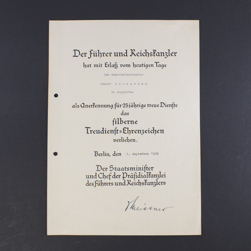 Nice and in very good condition 25 years faithful service (Treuedienst) award document, together with a WW1 Kriegsteilnehmer award document.