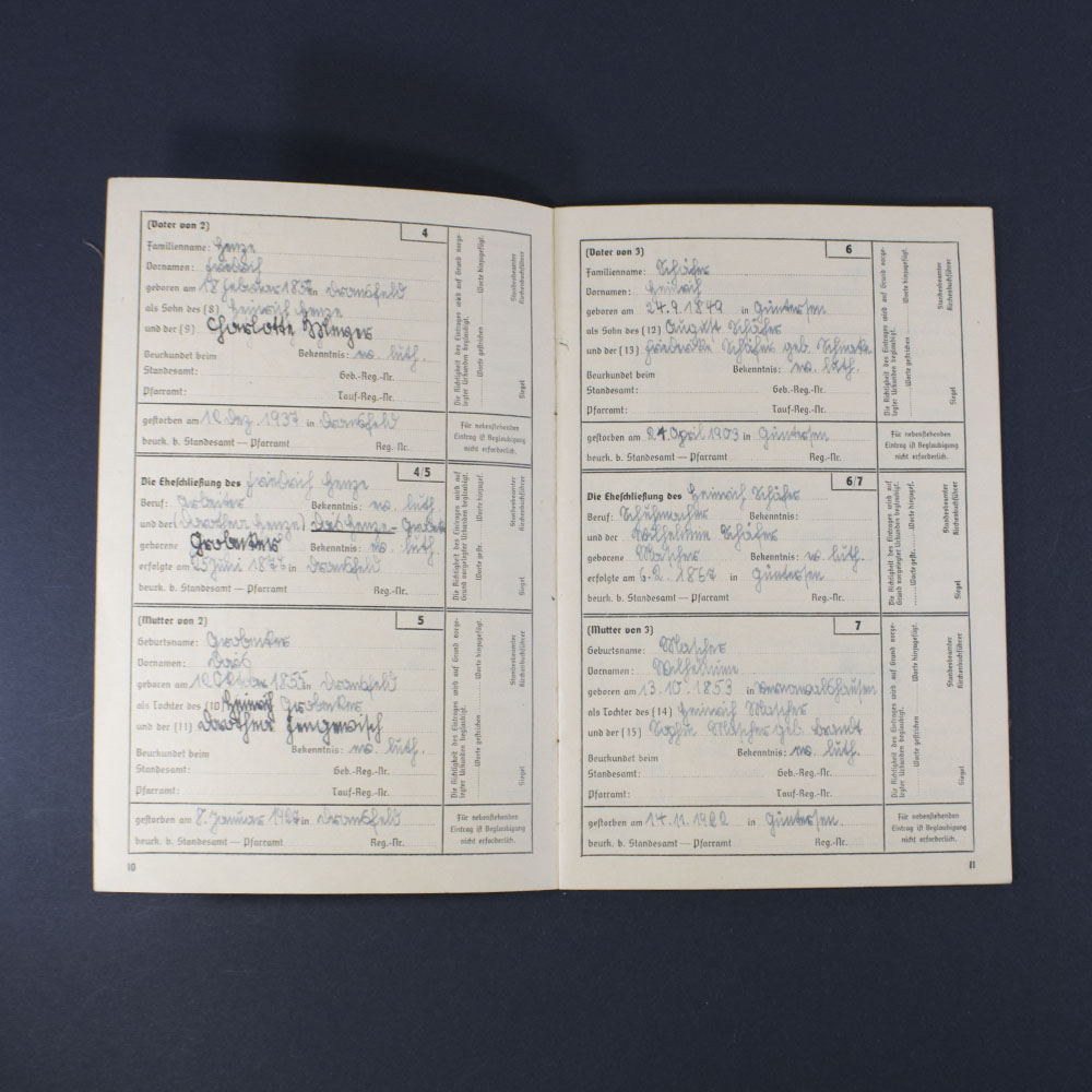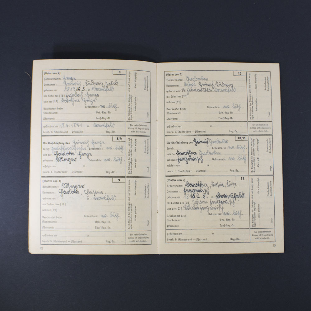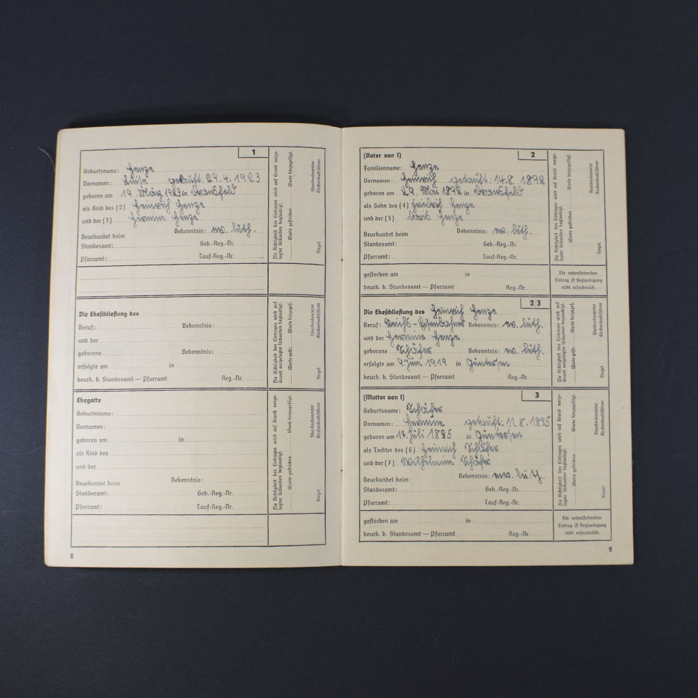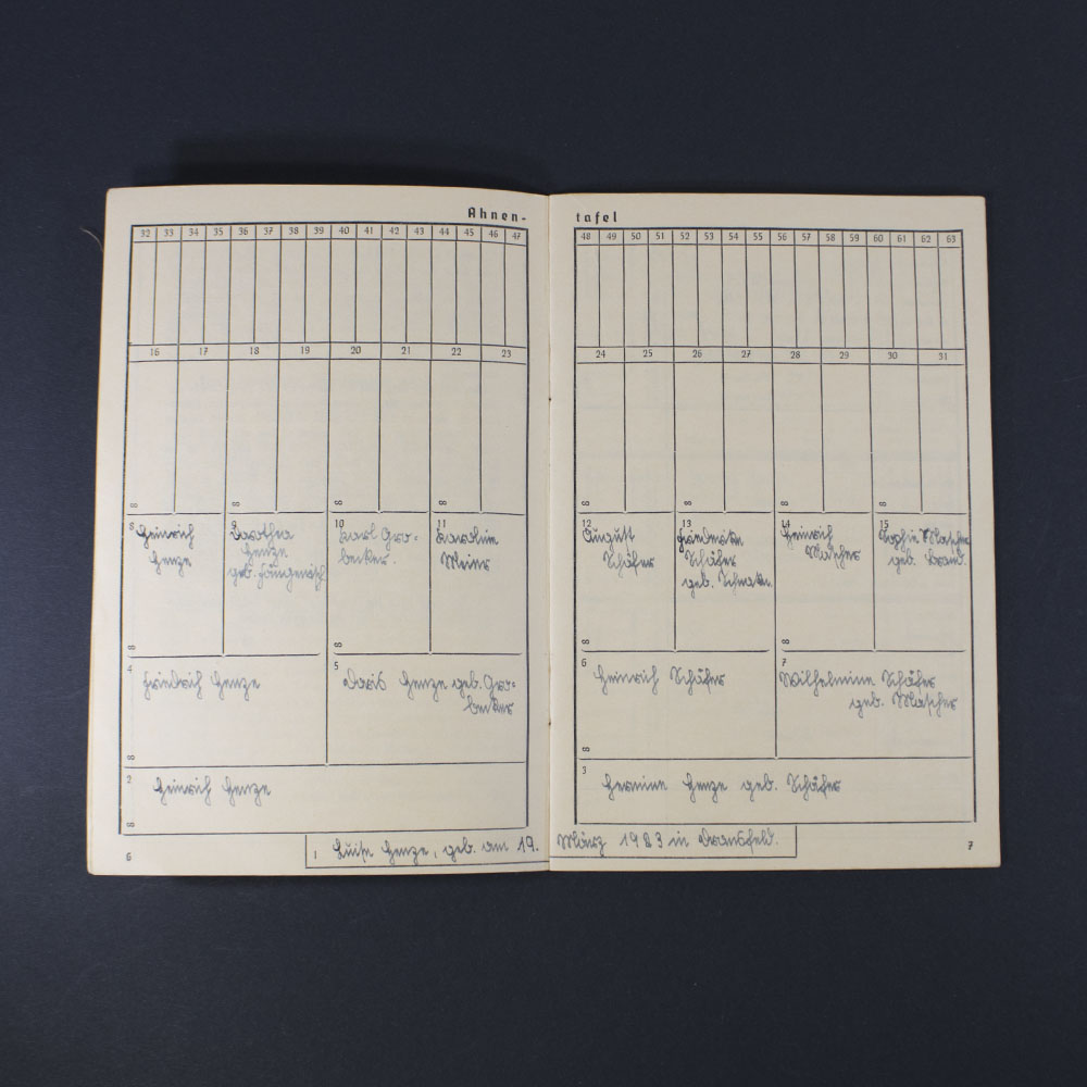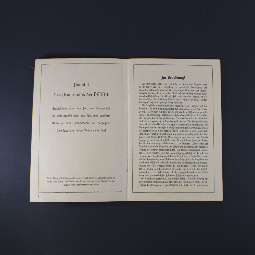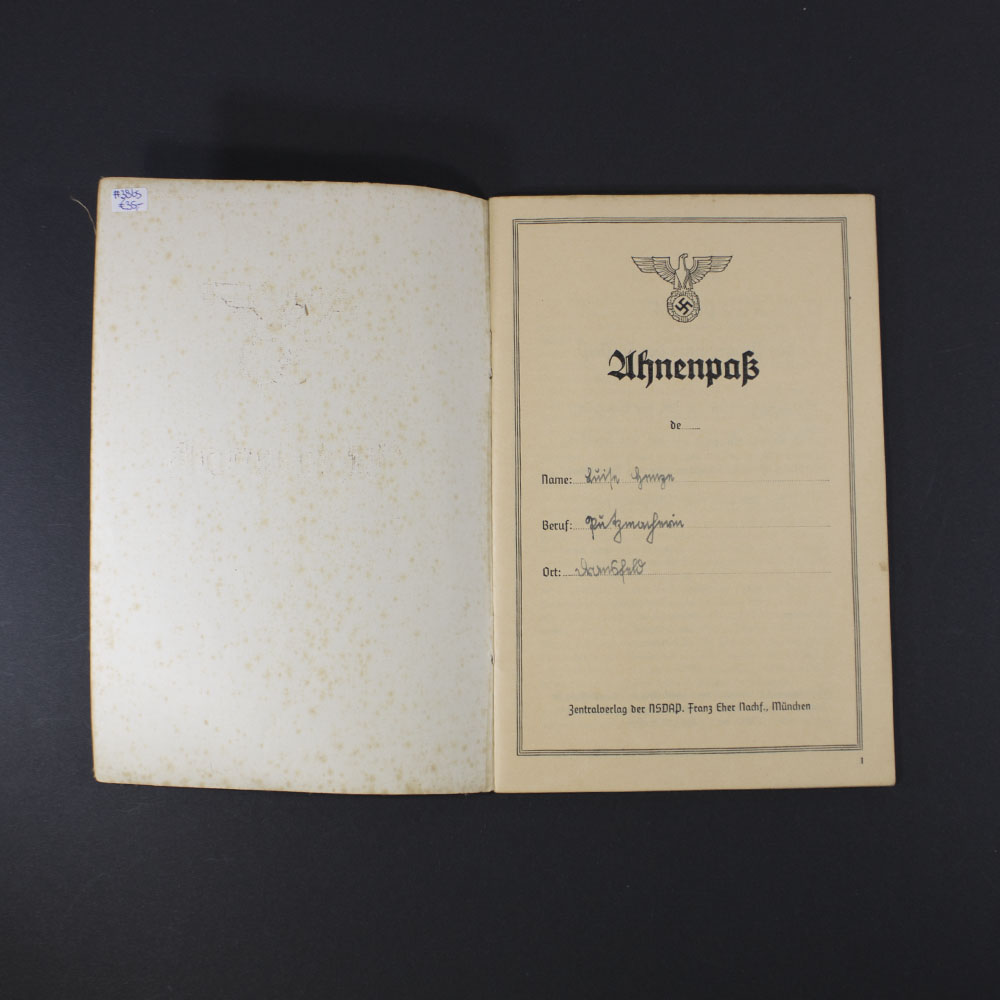The Ahnenpaß (literally “ancestor pass”) was a document used in Nazi Germany to certify the Aryan lineage of individuals considered to be “of German blood.” It was one of several types of Aryan certificates (Ariernachweis) and was issued by the Reich Association of Marriage Registrars in Germany (Reichsverband der Standesbeamten in Deutschland e. V.). The Ahnenpaß played a key role in enforcing racial laws and proving eligibility for employment, marriage, and social privileges under the Nazi regime.