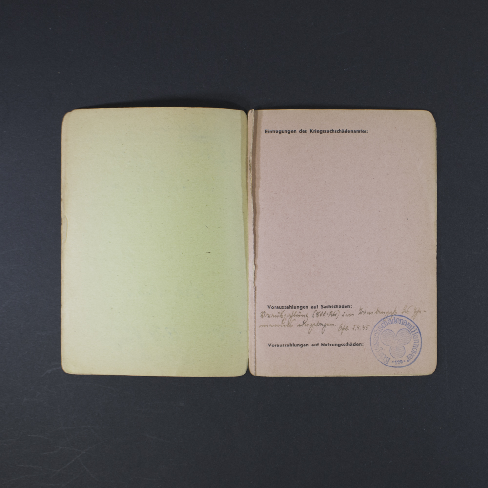 The War Damage Compensation Regulation (Kriegssachschädenverordnung) granted cash compensation equal to replacement costs. Homeowners whose houses were damaged or destroyed in air raids could claim this payment.