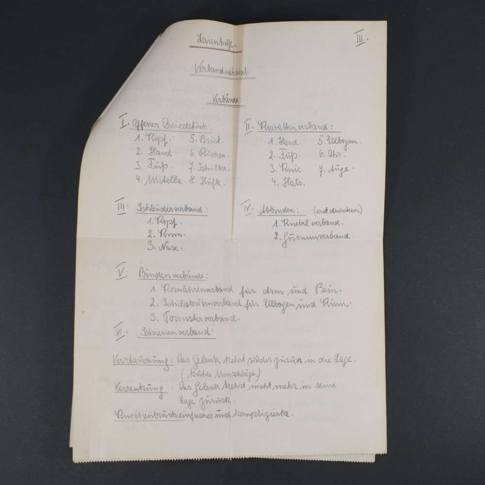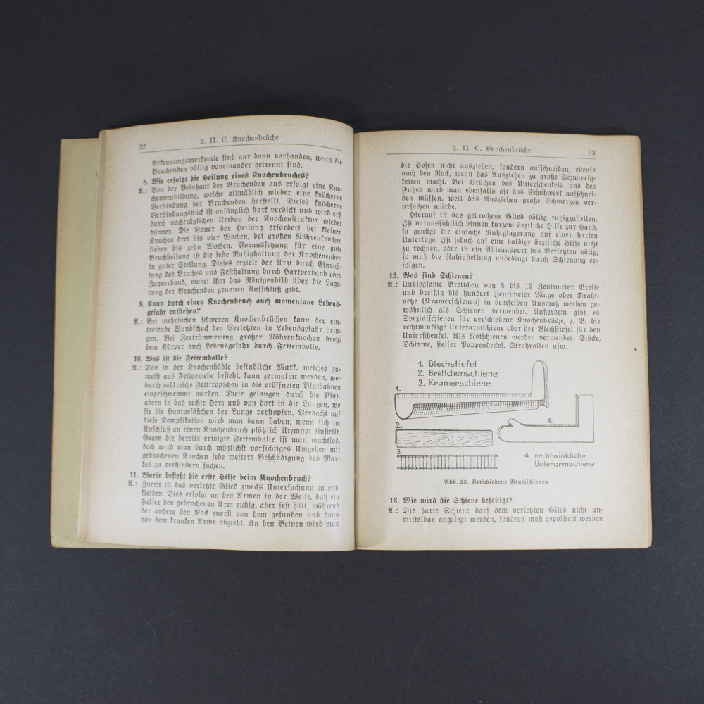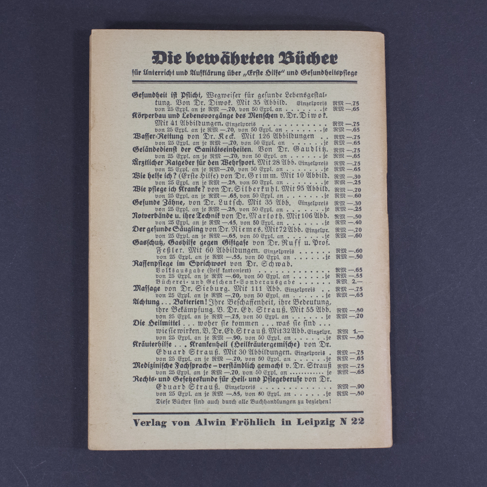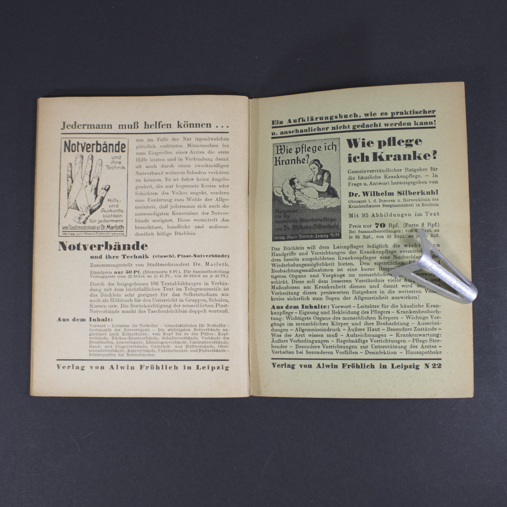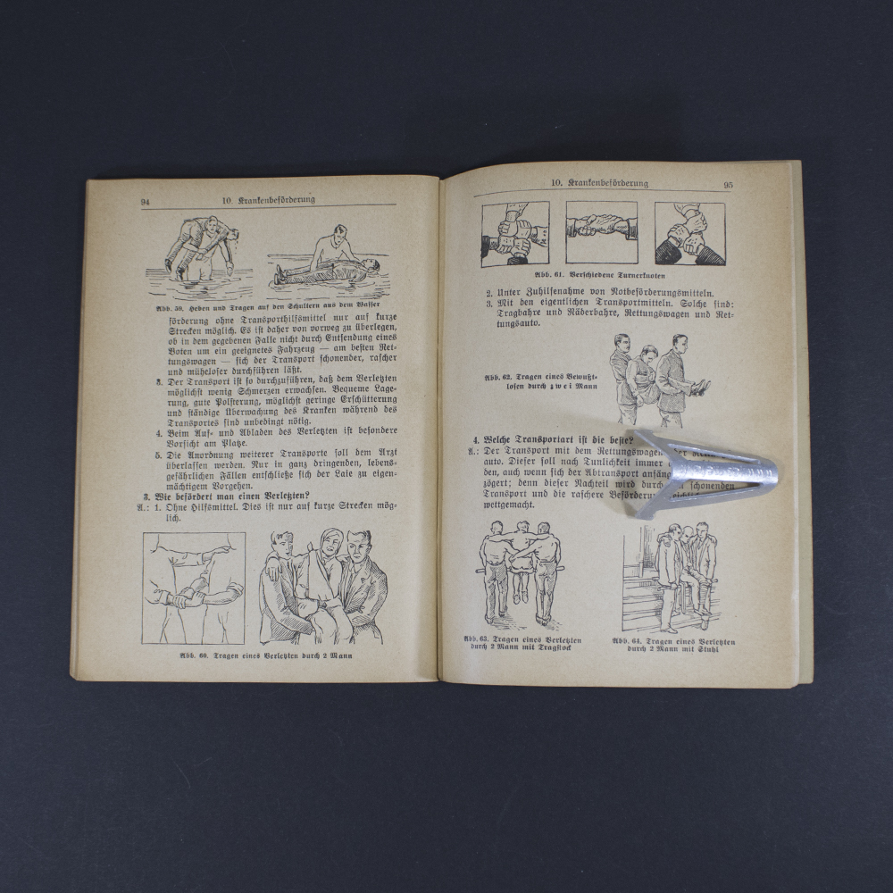his original 1940 German first aid book, “Richtig helfen bei Unfällen” (“Proper Help in the Event of an Accident”), offers a rare glimpse into WWII-era medical training. The book remains in very good condition and includes several extra papers found inside.
