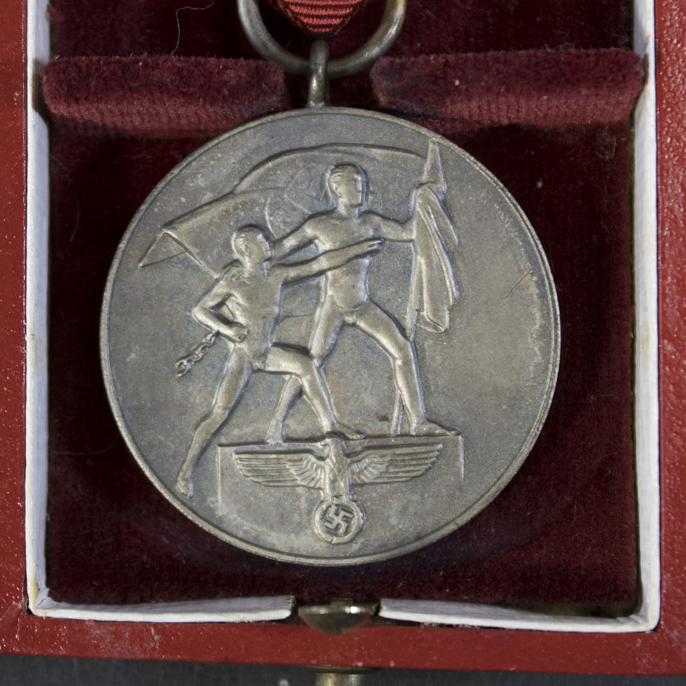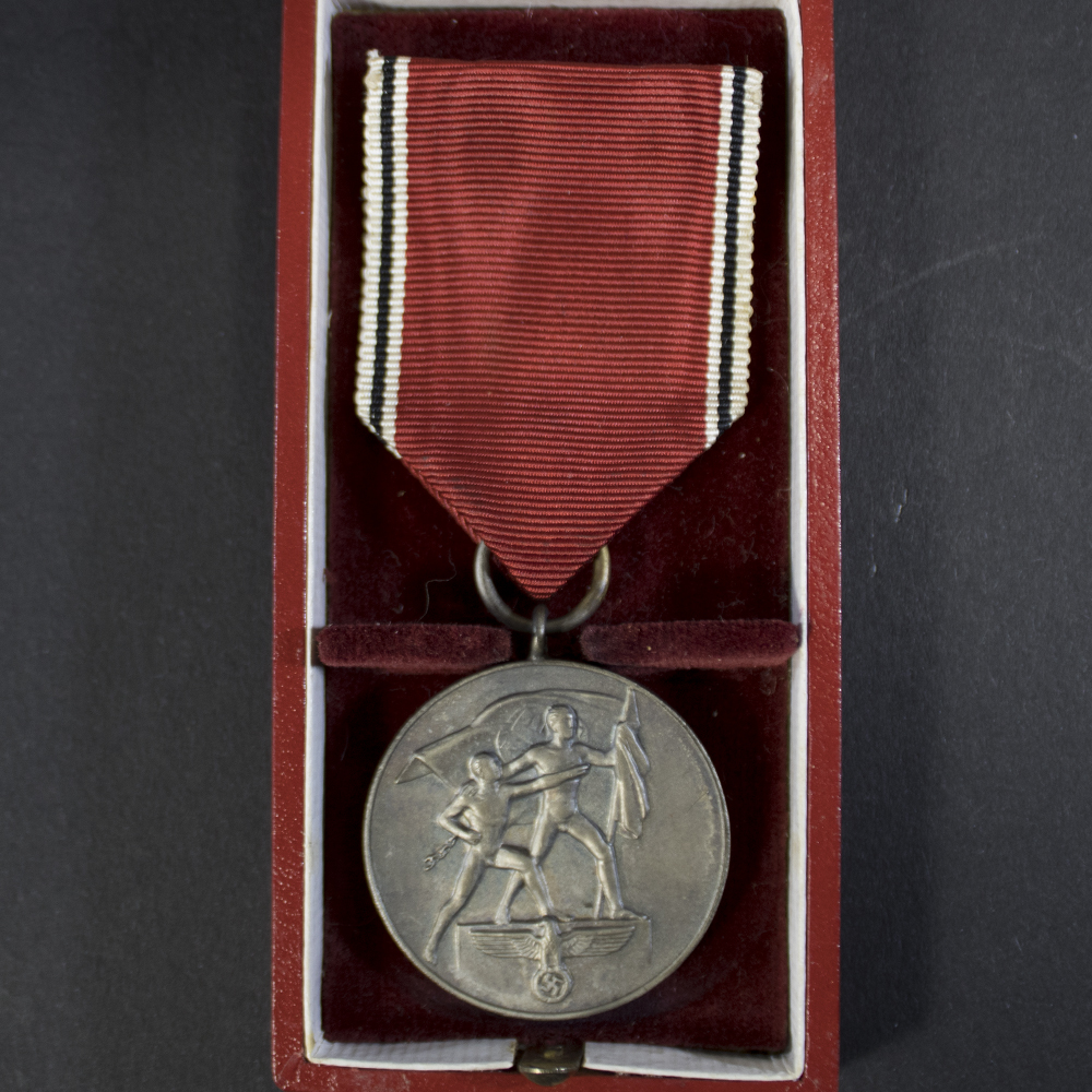 Established on 1 May 1938, this medal marked the annexation of Austria by the German Reich, known as the Anschluss. German forces crossed into Austria on 12 March 1938 without encountering resistance. The “Anschluss medal” was presented to both military personnel and civilians who contributed to or took part in the annexation. Recipients included German state officials, members of the Wehrmacht and SS who entered Austria, as well as local Nazis who supported unification with Germany, including widows of those who died for the cause. The medal was last awarded on 31 December 1940, with a total of 318,689 medals distributed.