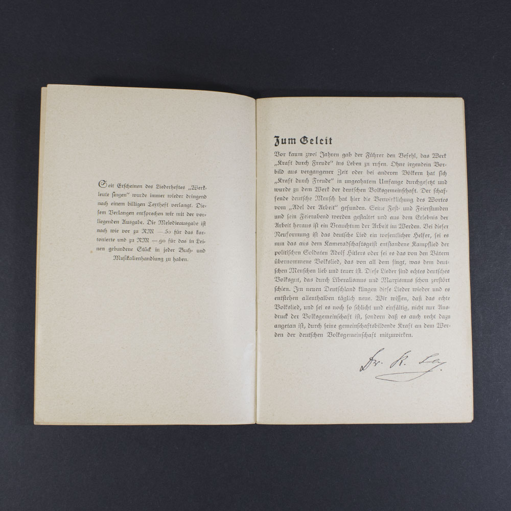 This is a very nice and well-preserved DAF (Deutsche Arbeitsfront) songbook titled “Werkleute Singen” (Workmen Sing in English). The songbook was used by members of the German Labour Front and contains traditional and organizational songs meant to promote unity and morale among workers.