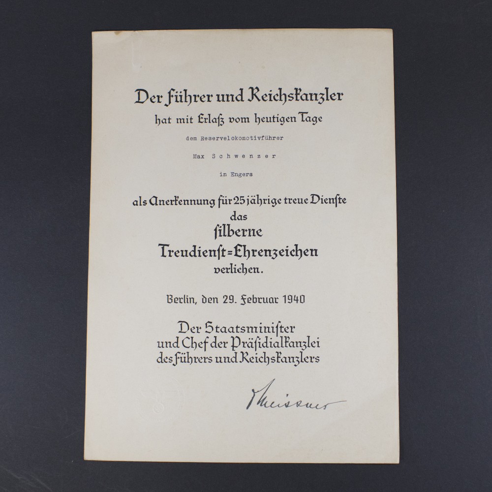 The Faithful Service Medal (Treudienst-Ehrenzeichen für Beamte, Angestellte und Arbeiter) was established on January 30, 1938, by Nazi Germany to recognize long and loyal service by civilians in the public sector. The award was issued in two main classes and a special single class, and was primarily intended for employees in government and public service roles, though it was occasionally awarded to individuals in private industry.