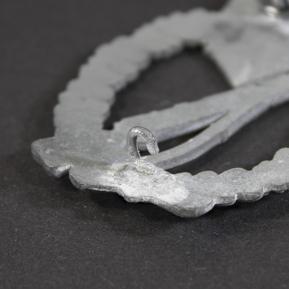 Very nice and in good condition silver Infantry Assault Badge. The badge has lost most of its finish and is NOT maker marked.