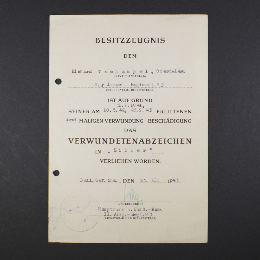 Very nice, in used condition, silver wound badge (verwundetenabzeichen) together with award document. The badge is maker marked 30 on the back. This maker can be attributed Hauptmünzamt Wien.