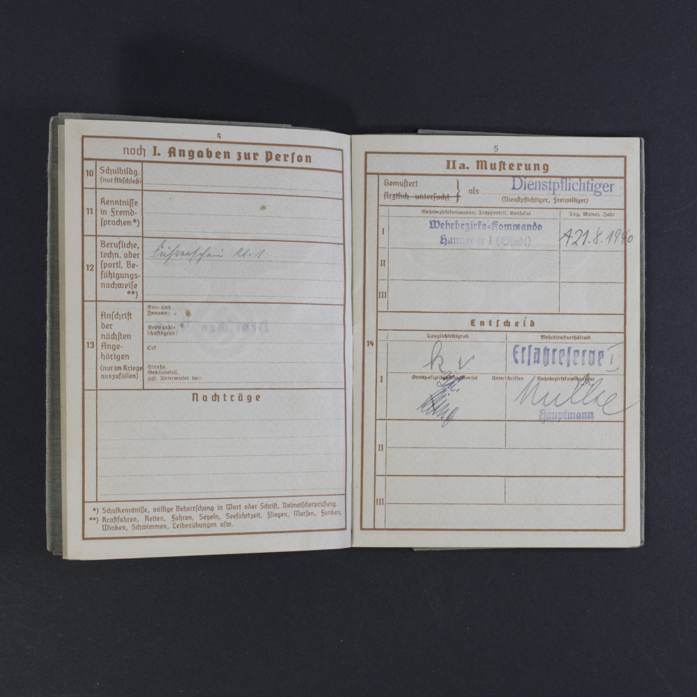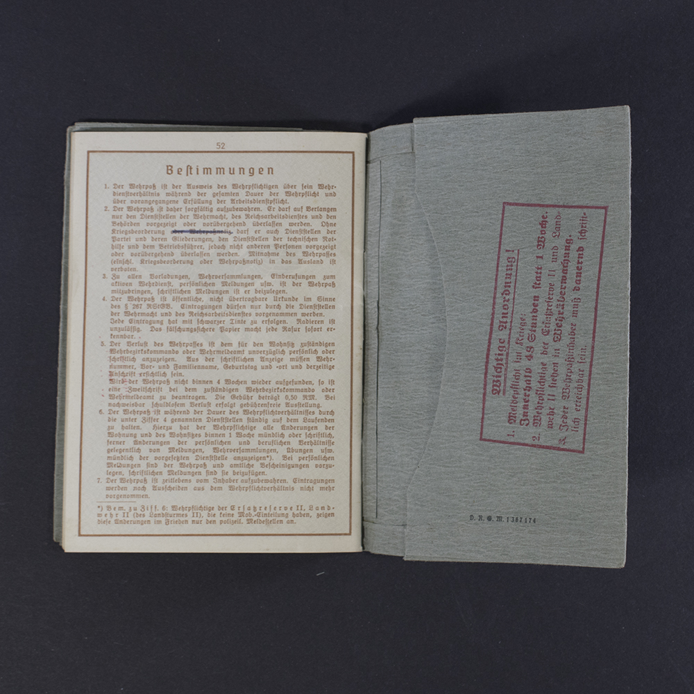 During the Nazi era, authorities introduced the Wehrpass after implementing compulsory military service and issued it to all conscripted male citizens. It recorded fitness for service along with personal details. Owners kept the document and used it to identify themselves to military authorities. When the individual was drafted, the unit received the Wehrpass. If the soldier died, the family received the Wehrpass.